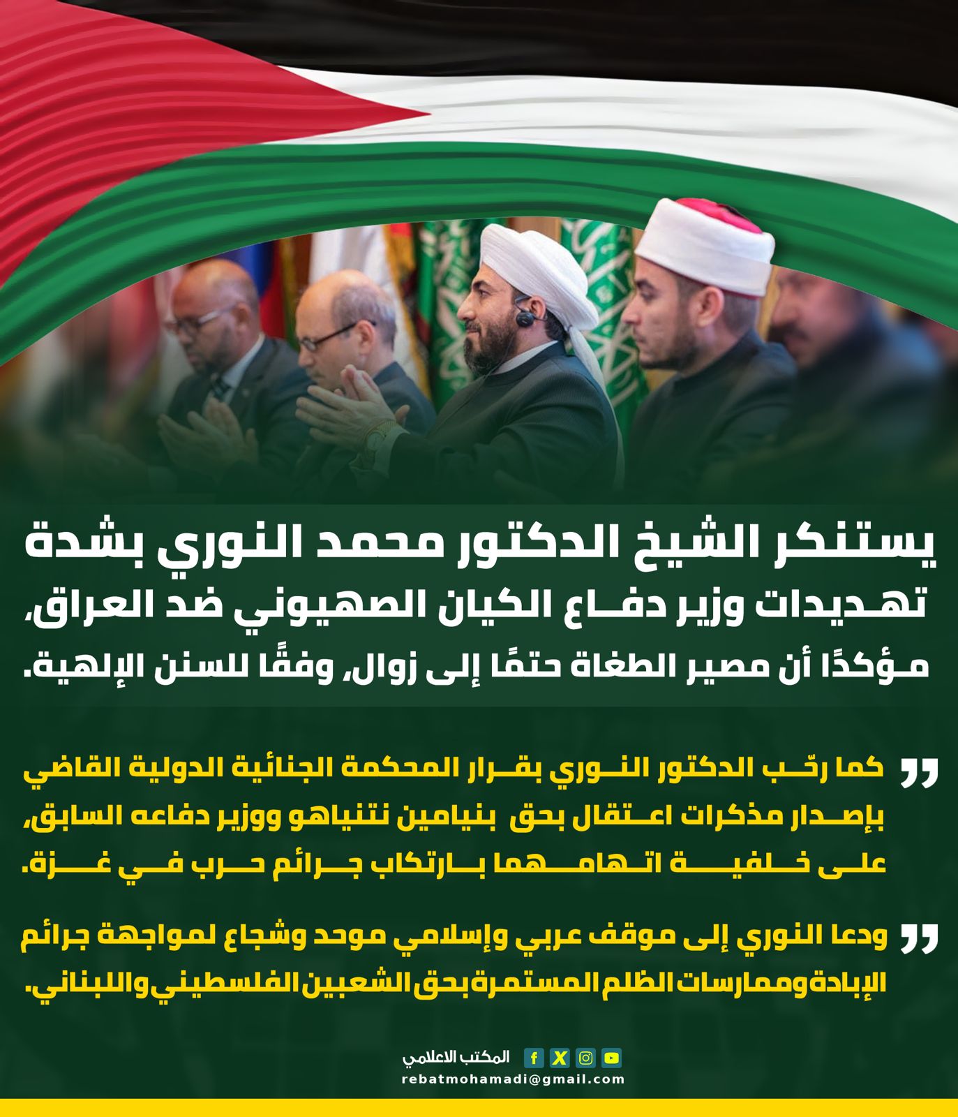 Posted in الرئيسية, المهرجانات والندوات, مجلس علماء الرباط المحمدييستنكر الشيخ الدكتور محمد النوري بشدة تهديدات وزير دفاع الكيان الصهيوني ضد العراق، مؤكدًا أن مصير الطغاة حتمًا إلى زوال، وفقًا للسنن الإلهية.by rabatmohammedi23 نوفمبر، 2024